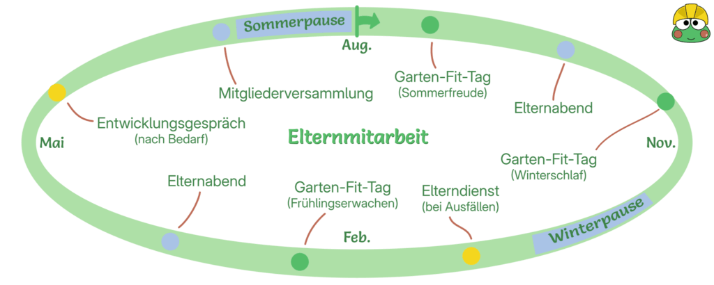 Zweimal im Jahr finden Elternabende statt, an denen die Teilnahme verpflichtend ist. Zu Beginn des Kita-Jahres gibt es eine Mitgliederversammlung. Dabei werden die neuen Eltern begrüßt und die Aufgaben für das neue Kita-Jahr verteilt. Drei mal jährlich werden gemeinschaftlich größere Aufgaben im Garten erledigt. Dazu gehört das Schneiden der Hecken, Pflegen der Bette sowie das Vorbereiten für den Winter. Nach Abschluss der Eingewöhnung und üblicherweise nach Geburtstagen findet ein Entwicklungsgespräch statt.
